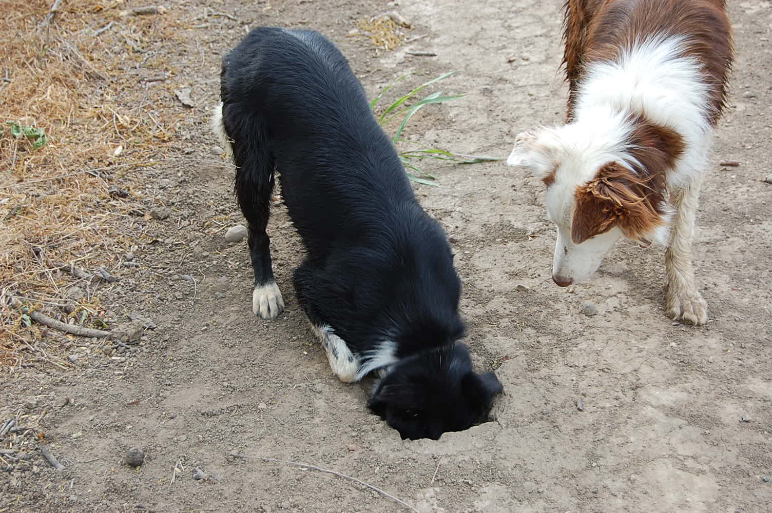Notice in the next photo that Bonnie is actually grabbing the edge of the hole in her mouth. She bites off chunks of dirt to make the hole bigger. Rusty watches, but doesn’t seem to care so much.