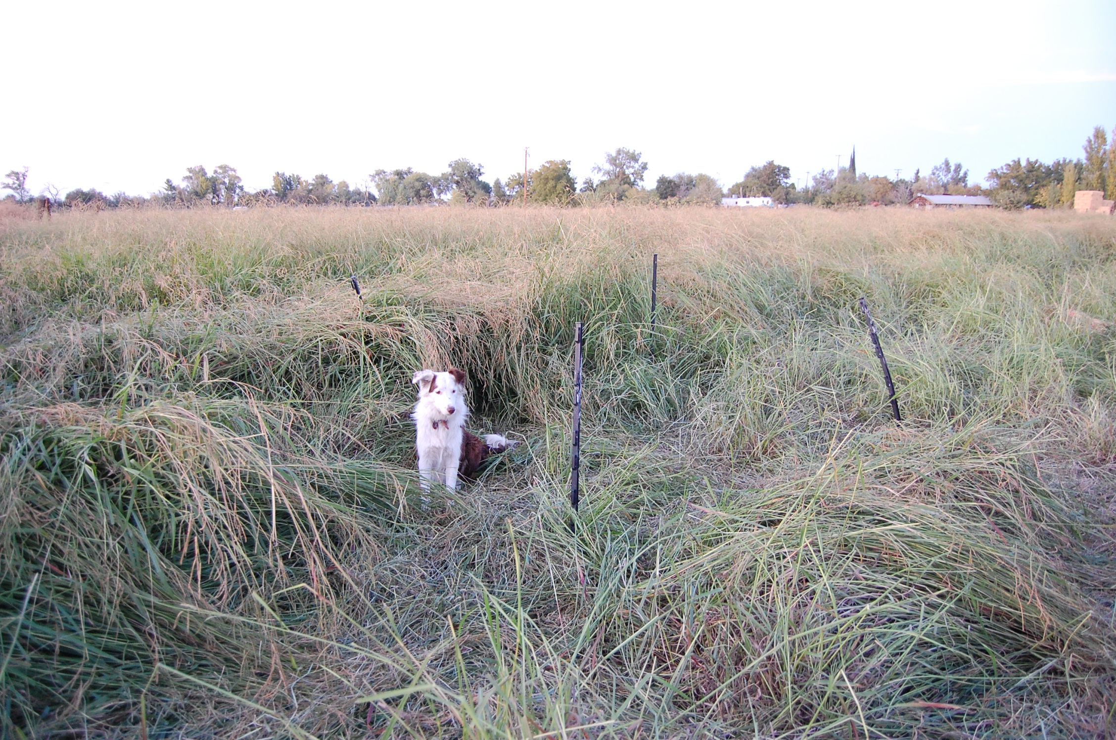 So what to do about it? I could try to get some cows in here. If they didn’t eat it at least they’d trample it. But I’m trying to make something work with the sheep. I have started feeding hay out here. I break the flakes of hay into smaller pieces and place it in strategic places in the tall grass. The photo below shows those same posts after 2 feedings in that area.  (Note the wooden post in the background of each picture.) The sheep  didn’t eat all that grass, but a good part of it is trampled down and hopefully broken up enough that something will grow through it after the winter rains.