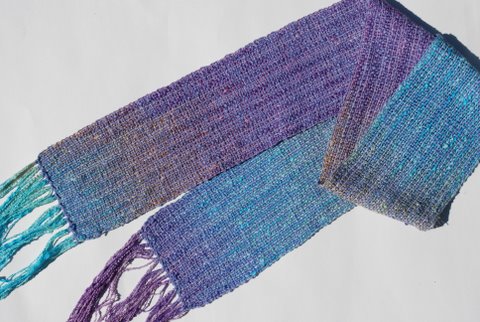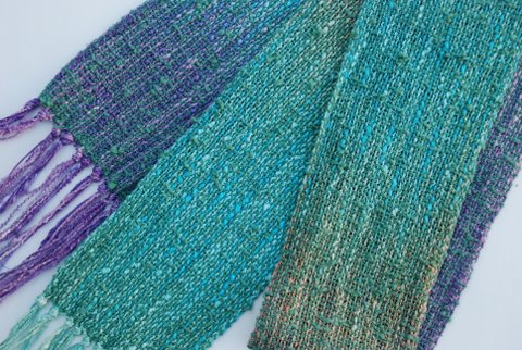 When I reorganized my shop I unearthed boxes and boxes of yarn, etc. Here are some scarves from a warp that I wound and space-dyed quite awhile ago. I like to plan warps and design projects but sometimes there are those days when you don’t want to have to think. What fun to pull out a warp that is ready to put on the loom.