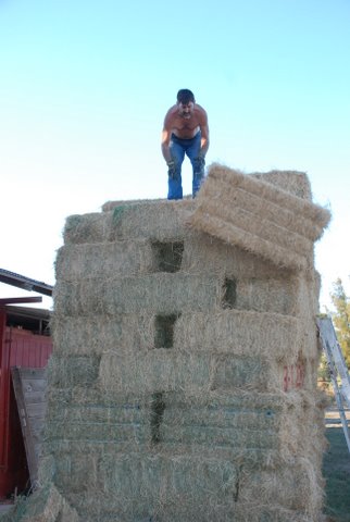Here is Dan dropping hay off the 4th stack. In 4 stacks of hay there are 320 bales. I bought 20 tons of alfalfa so each bale is about 125 pounds.