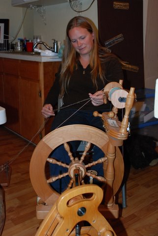 Here is Joan spinning away on the Ashford Travellor double treadle wheel, which worked really well for her.