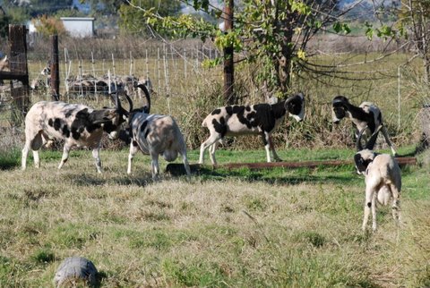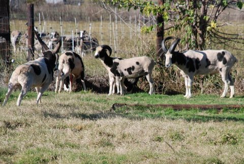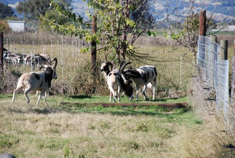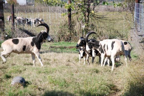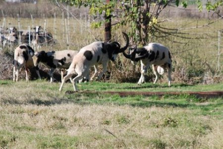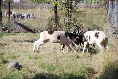 Savor and Tioga are still tussling here. Notice that Granite is confronting Diego, another 2-horned ram lamb (in 4th place ranking). Do you see the lowest ranking ram? That’s the 4-horn ram lamb from Michigan. However, what the other rams don’t realize, is that Clint actually had the last ewe to breed to himself. While the rams were in “jail” one of the ewe lambs approached the pen wagging her stubby tail. I took Clint out and he took care of the job quickly before he had to go back in with the bullies.