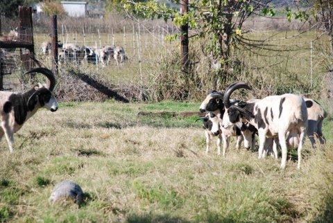 …but he’s not finished yet. Granite is the two horn ram lamb who is shying away from Savor’s show of authority. Granite is #3 under Tioga but there were a few challenges between them. I think that Granite will be ready to try again for the #2 spot after he is a little bigger. Tioga comes from mild-mannered ancestors. His sire, Ranger had his skull fractured by Houdini, a very aggressive ram I had a few years ago. Ranger healed and was always a well-mannered ram, as was his father, Rocky.