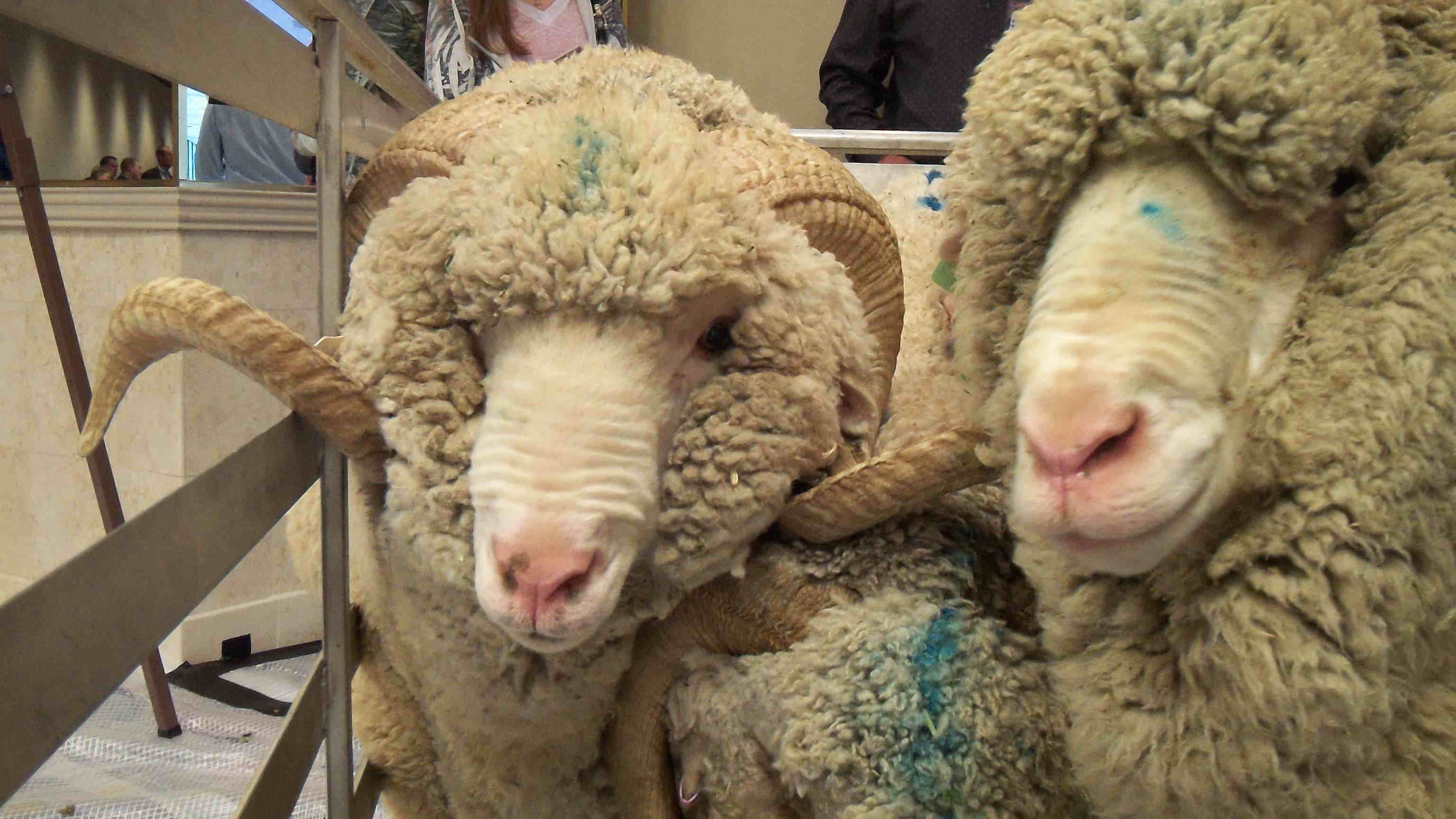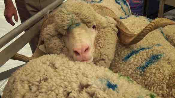 These are some magnificent Merino and Merino x Rambouillet rams, the only sheep in sight at the convention. The ranch also displayed some fine Merino fleeces. I wish that I could harvest a 20 lb fleece!