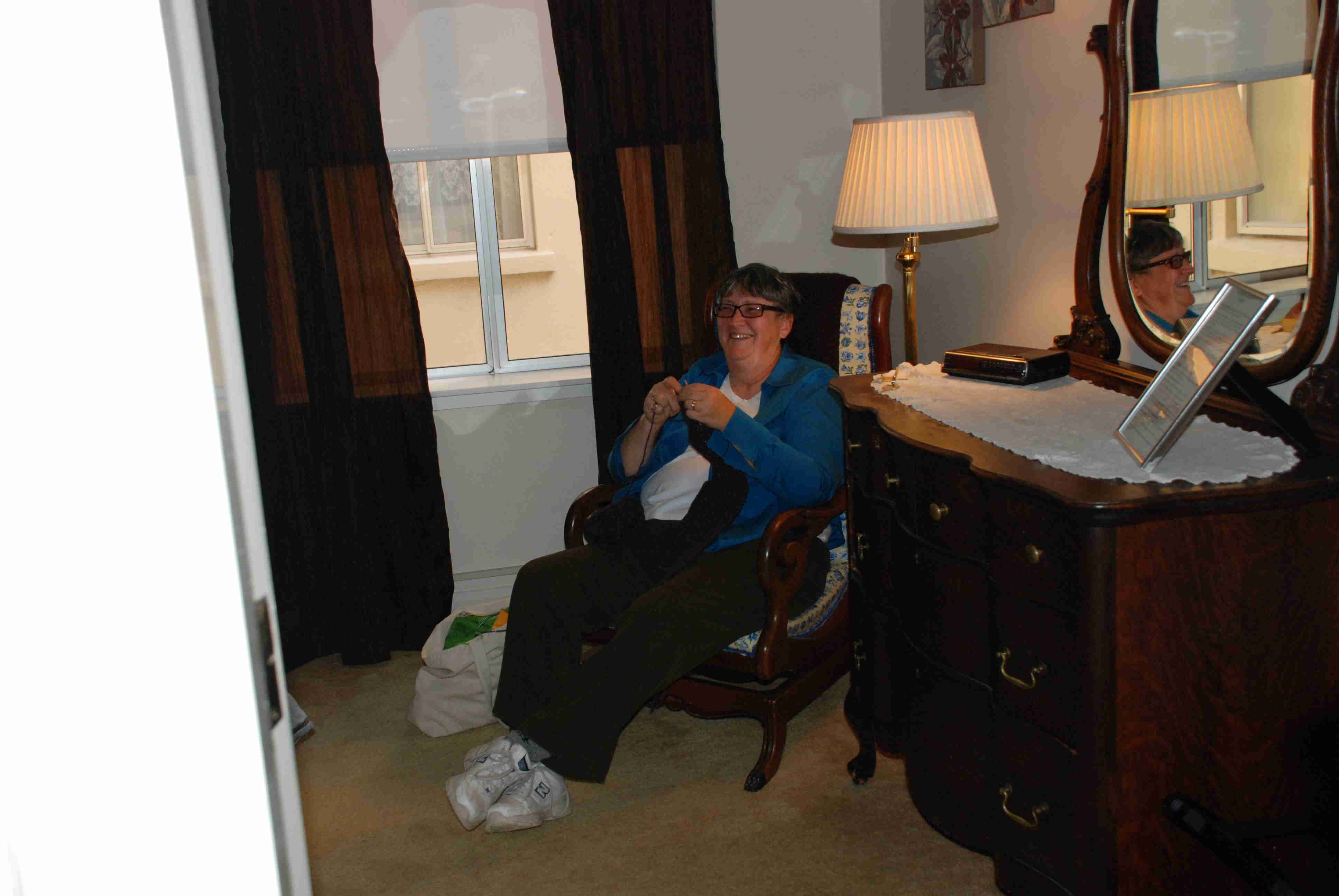 The rooms are all decorated differently with beautiful old furniture. It didn’t take Jackie long to get out the knitting.