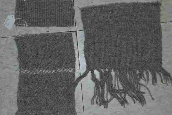 A llama and alpaca owner  sent me his mill-spun yarn to weave blankets. The alpaca yarn was OK for blankets, but not the llama–way too much coarse fiber. I wove samples to send to him.