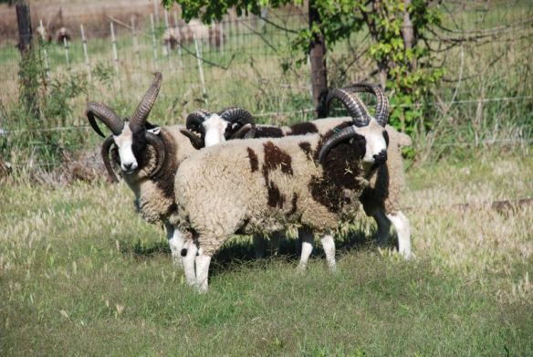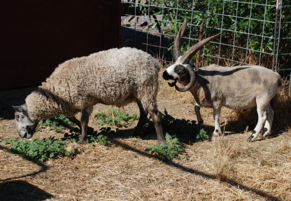 These are my 2 new rams–not a very good photo but you can see the difference in size   between Faulkner (BFL) and Hudson (Jacob).