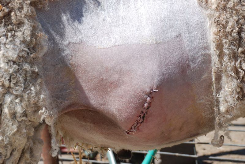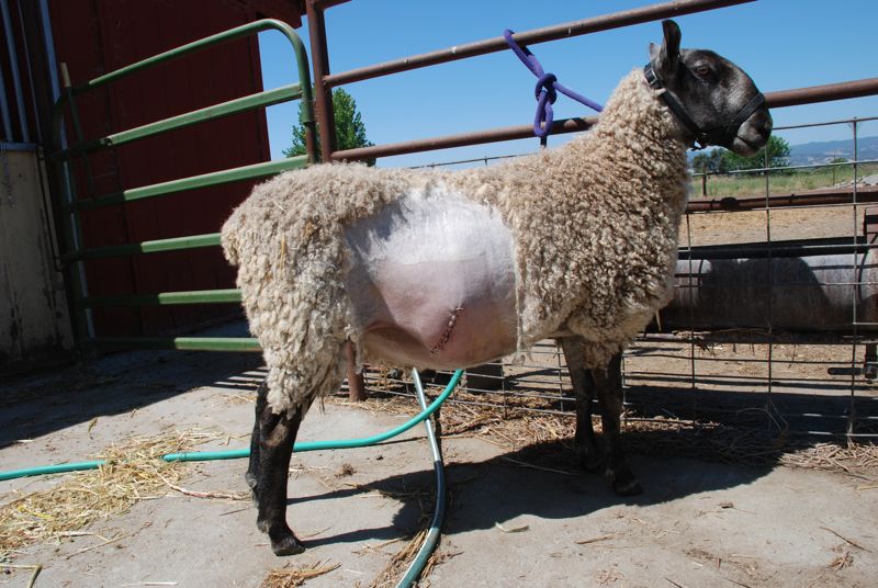 Faulkner, my new Blue-Faced Leicester ram, had a large swelling (about the size of a grapefruit and with no visible injury) behind his rib cage. I noticed it on the weekend and my veterinarian looked at him on Monday. The vet thought that she could feel an opening in the muscle tissue and recommended that I take him to the UC Davis VMTH to surgically repair it. Sure enough, there was a 2″ opening that required a much larger opening by the time it was done.
