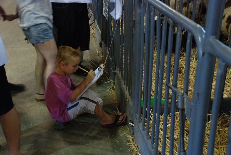 Here is a young fair-goer drawing in the spots and horns on a sheep drawing we provided.