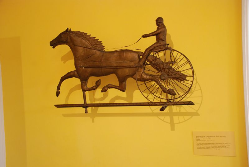 The Museum grounds are full of incredible buildings. This horseshoe-shaped barn houses dozens of sleighs and buggies on two levels. Other buildings house a 1″:1′ scale circus train, blacksmith shop, printing presses, dental office, general store, apothecary, toys, dolls, quilts, wooden decoys. Can you imagine entire displays of glass canes, trivets, crystal glasses, hatboxes, embroidery samplers? The list goes on. At the end of the day when we found there was only about 35 minutes until closing we breezed through the Fashion exhibit and had to skip a couple of other buildings.