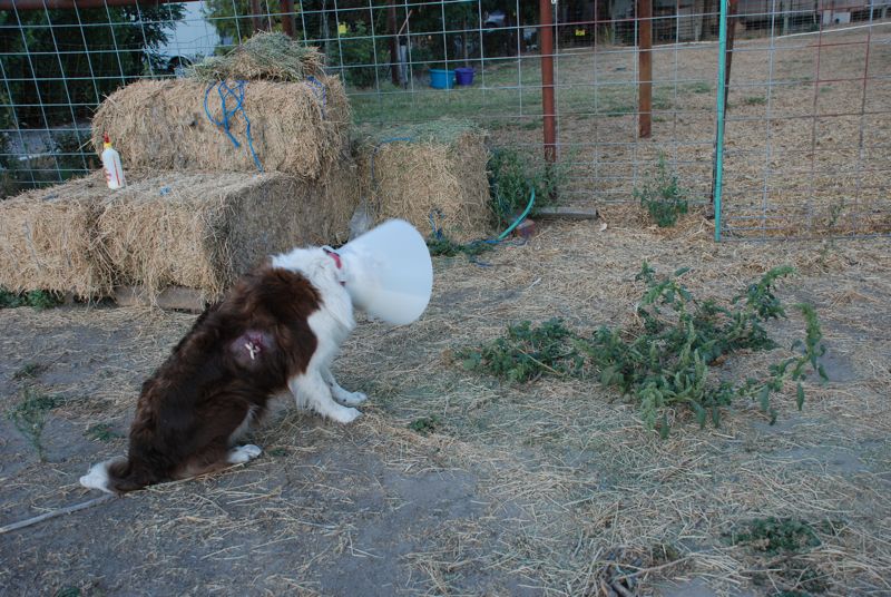 Here is the fix for the dog. There are staples and a rubber tubing that acts as a drain. Isn’t that one sad puppy? He wants back in the sheep pen.