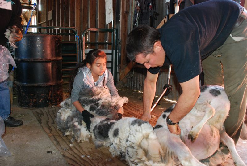 Our shearer, John. Hailey is scooping up fleeces.