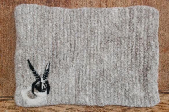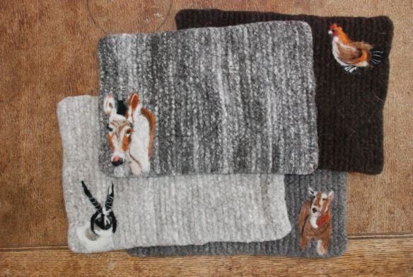 These are four placemats. Jackie bought fiber from me, then spun it, knit it, felted it, and then needlefelted the designs. (Is that little red hen in the corner Jackie’s self-portrait?)
