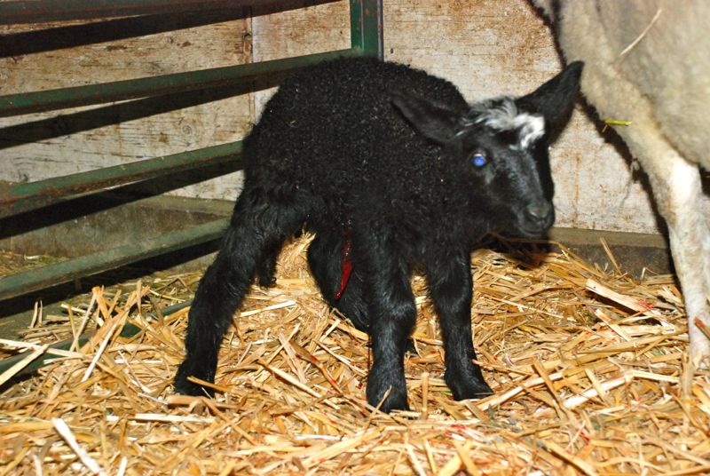 However I am not disappointed in the lambs. I experimented with breeding to Faulkner, the Blue Faced Leicester ram, to find out if I could produce larger market lambs without having deleterious effects on the ewes. Rusty wrote about the first set of BFL/Jacob lambs in his blog. (By the way, the lambs he wrote about were born to Athena, the ewe standing in the photo in my last post. I called her Summer by mistake, but Summer is the huge one in the photo below.) Another lamb was born last night.