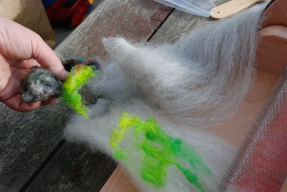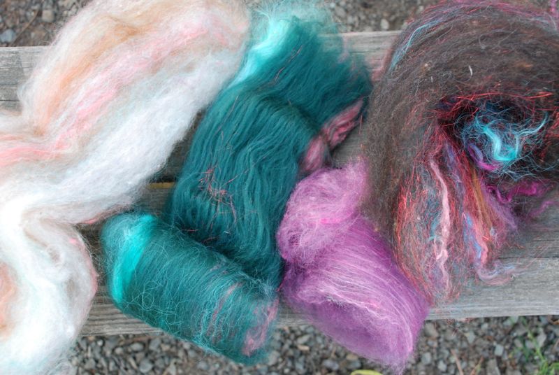 Playing with the drum carder Posted on February 21, 2012 by Robin I taught a drum carder class today. Here are some results. Dona added neon green to white Jacob. Ania blended blue and gray. Paula went wild with color mixes. These are some of Ania’s blends drafted into roving. Share this: Click to email a link to a friend (Opens in new window) Email Click to share on Facebook (Opens in new window) Facebook Click to share on Pinterest (Opens in new window) Pinterest Like Loading... Related