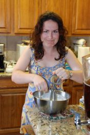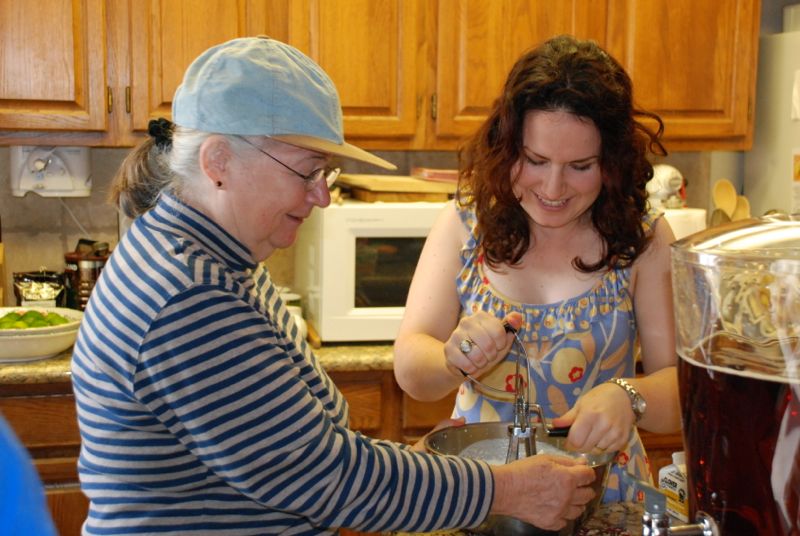 Last minute food prep as Shelby gets a lesson in whipping cream.