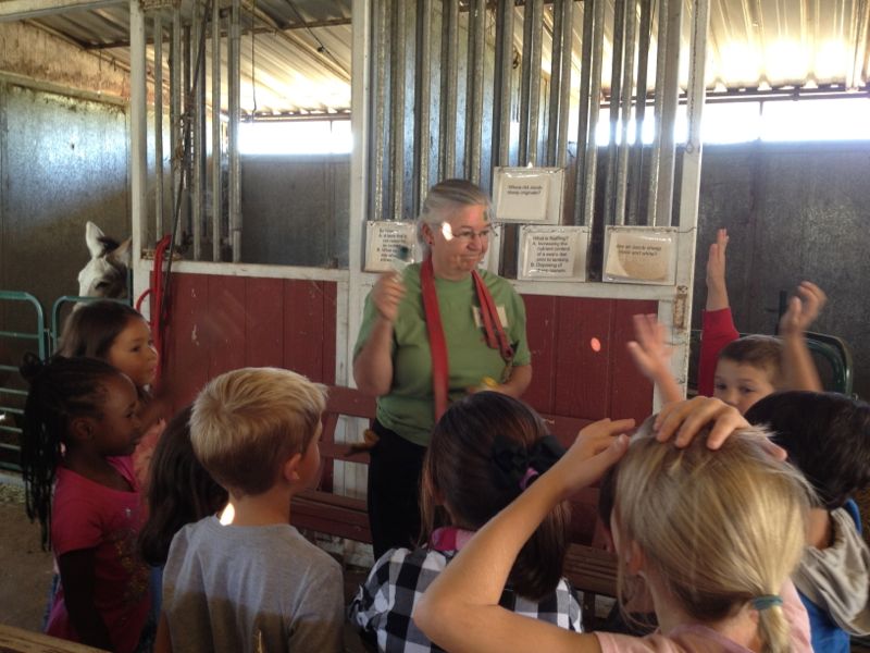 Today I hosted a field trip for 24 six and seven-year-olds and their accompanying adults. Thanks to the Farm Club for helping me out yet again. Kathy, Dona, Mary, and Maggie (Mary’s daughter) all helped with the kids. We split into two groups for petting animals, learning the differences between hay and straw, sorting “sheep” in the chute (with shoe-laces, without shoe laces), etc. I don’t have many photos because we were busy with the kids but I caught a few.