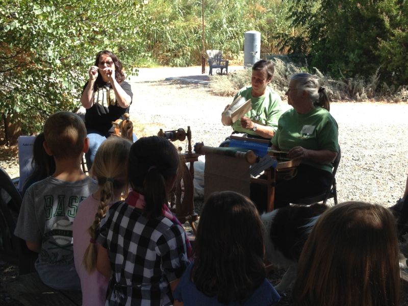 Then the kids watched us demonstrate carding, spinning, and dyeing. We read a story, gave them all a postcard with Rusty’s photo and they got back on their bus. Us adults retreated to the shop for de-briefing and visiting with the A/C going. Thanks Farm Club!
