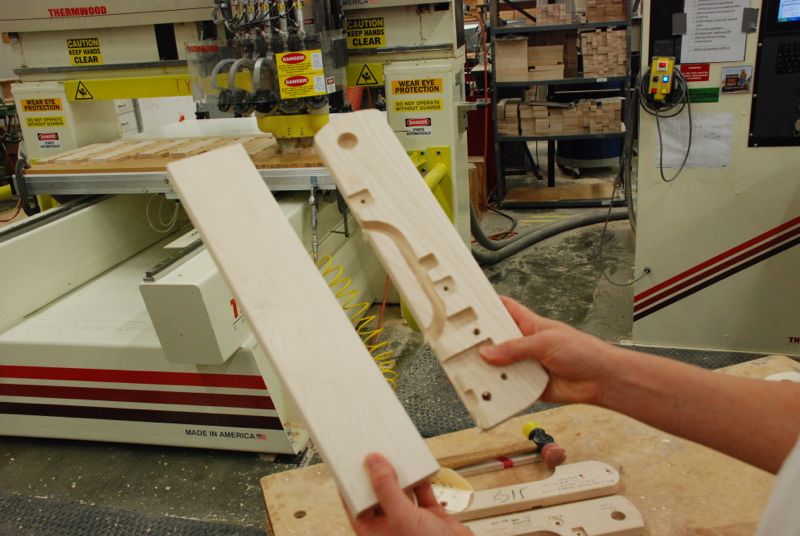 When you look closely you see that the machine is drilling and changing the block of wood on the left into the one on the right. This is one side of the Flip loom.
