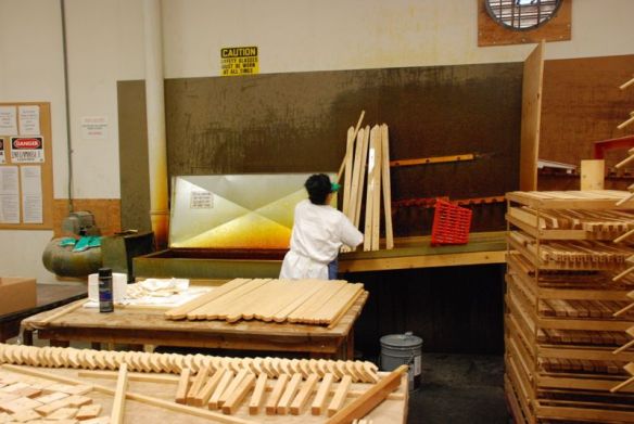 Each piece is sanded using a variety of machines–ones that do flat surfaces, ones like this one with stiff bristle rollers that sand inside all the crevices and holes.