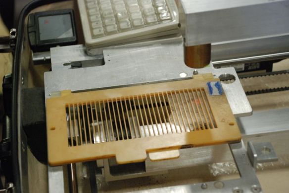 Also Saturday afternoon–AFD (Average Fiber Diameter) testing for anyone who brought wool samples (or took scissors and cut samples from the sheep that were there). This is Ron Cole from ASI, who taught the Wool Handling Workshop in California a few months ago. He brought the OFDA (optical-based fiber diameter analyser) used to measure wool samples and I think he ran about 200 in the few hours he was there. AFD and some of the other statistical measurements are of importance to sheep farmers because it is AFD that determines the best use and the market for wool.