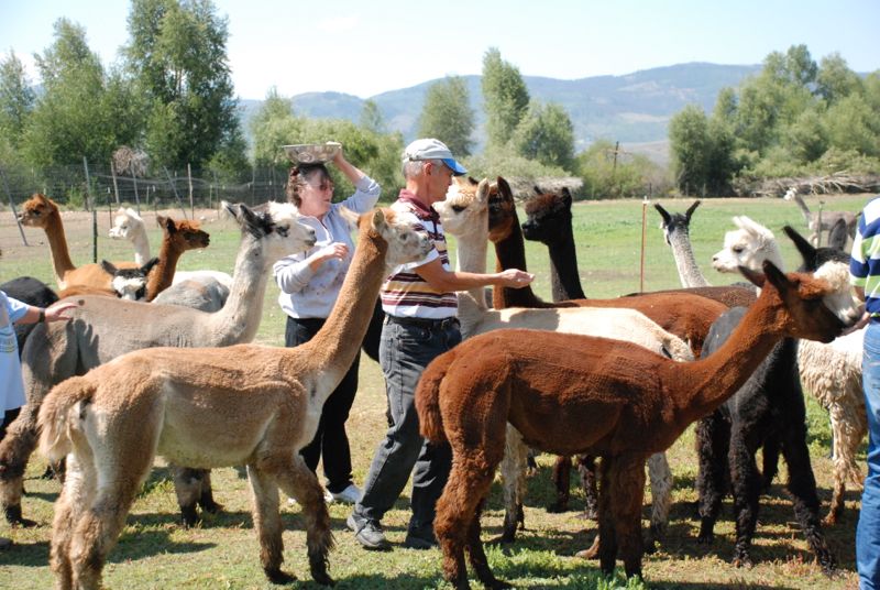 Note the bowl on the head method of bringing alpaca treats to the field. Once the bowl was lowered the treats were gone within seconds.