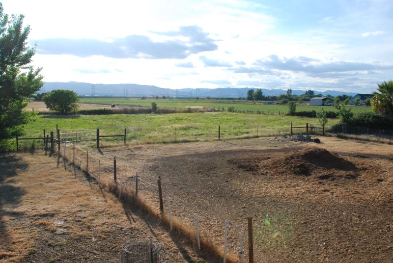 View from the second story of the barn looking northwest. We are on the western edge of the Sacramento Valley and those hills are the easternmost part of the Coast Range. The mound in right foreground is the all important manure compost pile which features prominently in several Lamb Game Videos.