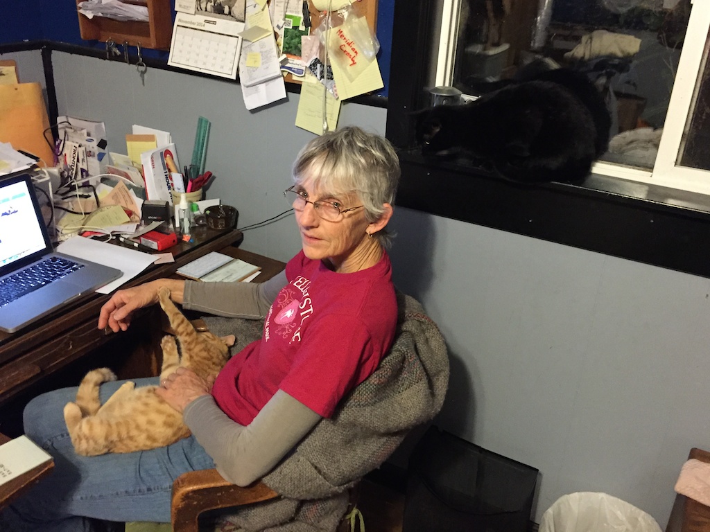 After I got back from a Board meeting at the Artery I brought the crate in the house and the kitty spent most of the evening in my lap while I sat at the computer. Note Ozzie who blends into the darkness on the windowsill.I