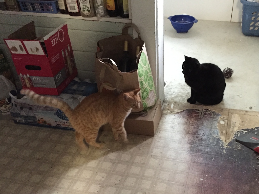 This morning I put up a fence and let the kitty on the back porch where there is a litter-box. (Did you know that WordPress corrects cat box to read hatbox?) Everyone watched.