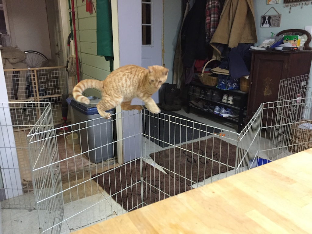 Ozzie could come and go but remained skeptical. I spent longer than I should have, not watching kitten videos, but taking kitten videos. Later I put the kitten back in the crate while I was outside. Tonight I let him out on the back porch again with the fence to keep him contained.
