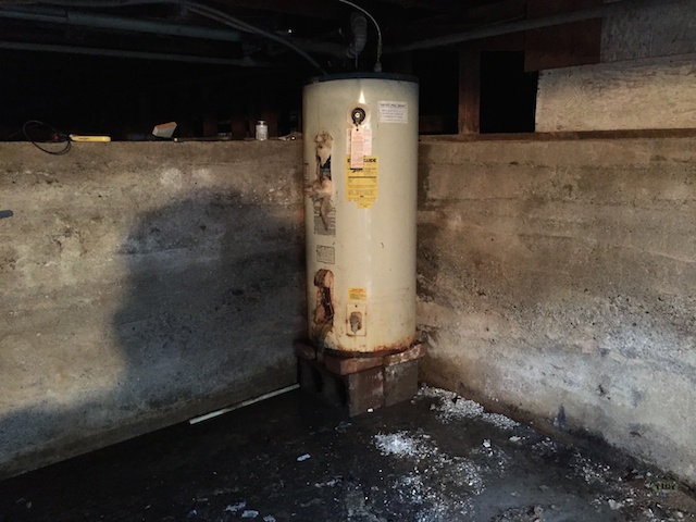 Saturday night I heard a leak in the cellar. (This is a low-ceiling room beneath the house with access from the outside. Before the drought years this basement would flood 3-4 feet in the winter and we had to keep a sump pump running so that the water would not flood the water heater.) It turns out that the old water heater was leaking, probably as a result of the higher pressure that our new pressure tank was providing to the house. I won’t show a photo of what this room looked like before I cleaned out all the junk that was along these walls because that is embarrassing. Believe me that it was not pretty considering what kind of critters spend time in basements and the fact that it has flooded periodically.