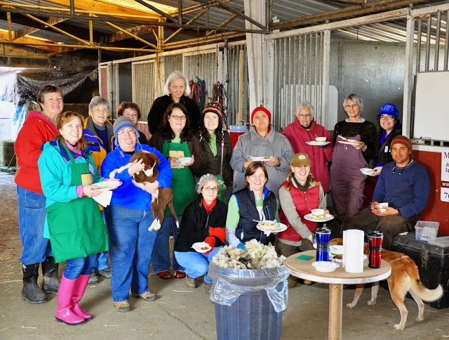 DSC_0505 Gynna was one of our sheep wranglers, feeding sheep to the pen where Stephany had them ready for the shearer.DSC_0540 Alison was at the skirting table all morning teaching FC members and other visitors about evaluating and skirting fleeces.DSC_0705 An important part of any fiber gathering is the food. We wouldn’t want to starve in the three hours it took to shear the sheep. This is the pot of vegetable chili I made and everyone else brought wonderful side dishes.DSC_0713 After shearing we could enjoy lunch. That’s our fabulous shearer, John, on the right. And everyone else are FC members. We missed getting Kathleen and Jackie in the photo.  It’s hard to corral this group. (And somehow we missed Rusty. I think he was lying in the sun after a long morning of watching sheep crouched on the concrete floor.)DSC_0716