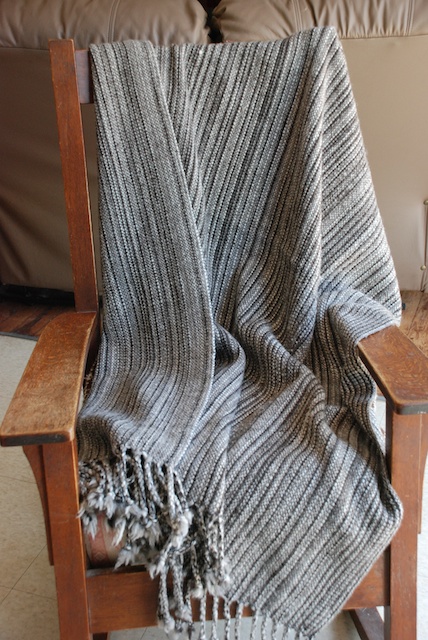 A handwoven blanket of Jacob yarn on Mom’s rocking chair.