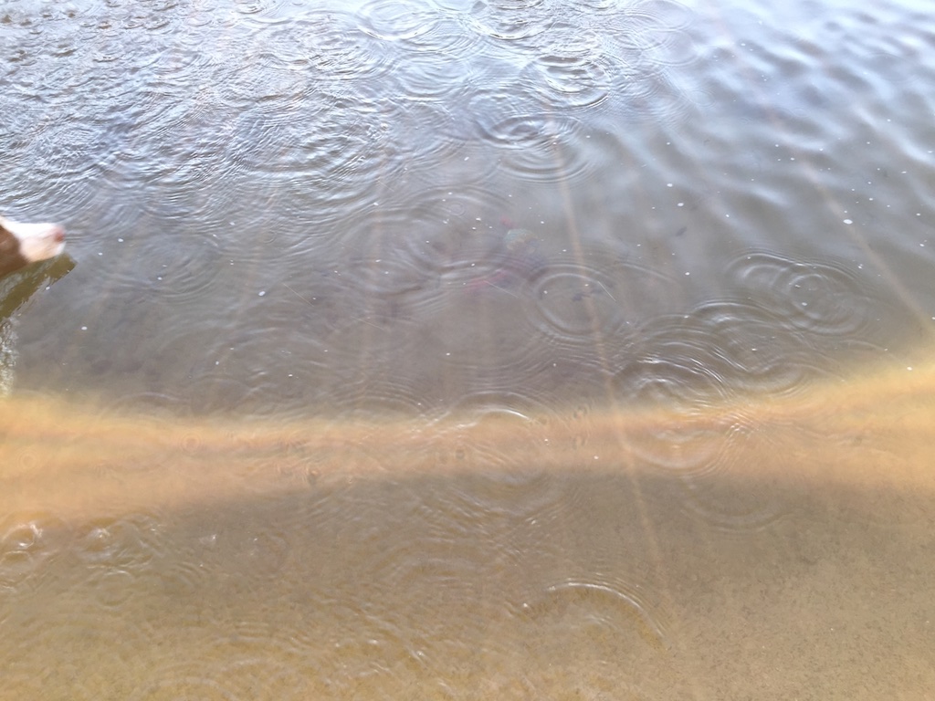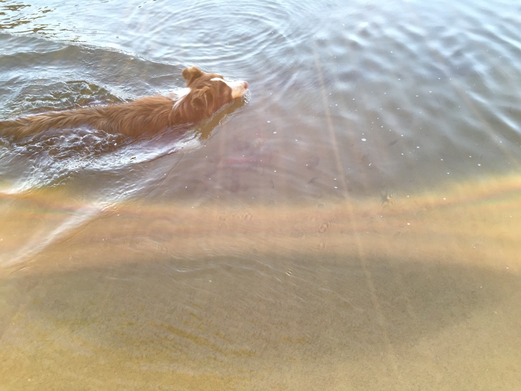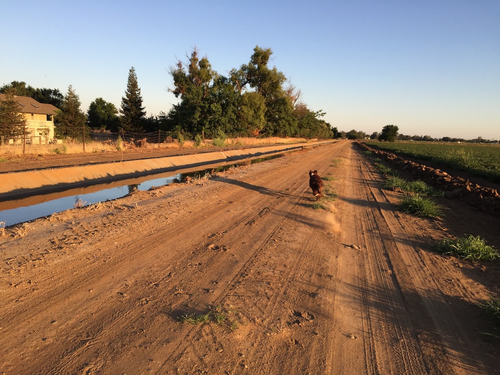It was still over 100 degrees at 7:30 when we walked Across the Road so the water in the ditch felt good. IMG_4572 Ginny carried her Toy and in this photo dropped it at the side of the ditch before she got in.IMG_4574 The idea, of course, is for me to throw it…IMG_4575 …so she can chase it…IMG_4580 …over…IMG_4581 …and over.IMG_4583 IMG_4586 At one point Ginny dropped the Toy too close to the edge of the ditch. The toy used to float, but not anymore. Ginny went in after it but once it goes under water she can’t see it.IMG_4587 The Toy is visible in those photos at the bottom of the ditch. Ginny stirred up the mud while swimming and that made the visibility worse for me. IMG_4589I ran to this crossing and saw that 2×4. I crossed the ditch and ran back to where the Toy was floating downstream and after awhile was able to rescue it. (It wasn’t easy to force the 2×4 down into running water when it really was meant to float.)IMG_4590 We continued our walk but during one catch attempt the Toy bounced off Ginny’s mouth and into the ditch again. Again Ginny went in but couldn’t see it under the water. IMG_4593 This time I found a tree branch to rescue the Toy. I’m going to have to pay more attention to where I throw it or find a toy that will float.IMG_4595
