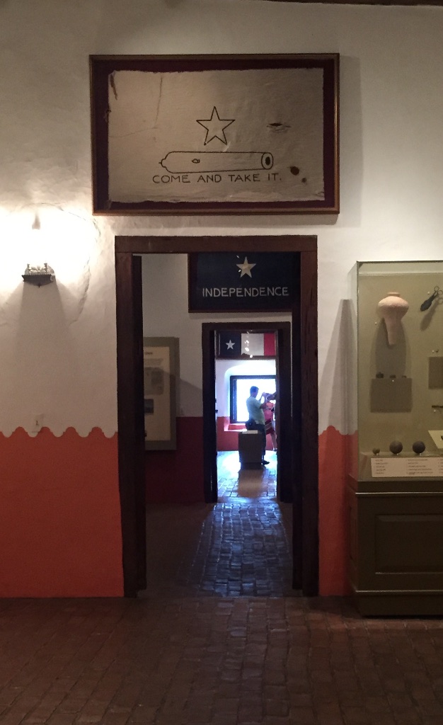 After our visit to the Alamo two days before we were ready for another trip into Texas history. We headed a couple of hours southeast to Goliad State Park, the location we knew as the site of the the 1836 Goliad Massacre, when General Santa Ana ordered the murder of Texas soldiers who had surrendered. But there is much more history than that.Goliad State Park-Mission E.S. (1)Our first stop was at the Mission Espiritu Santo, built in 1722, moved in 1749 to it’s current location, and restored in the 1930’s by the CCC, where the Spanish began “civilizing and Christianizing” the native people with the intention of making them Spanish citizens and, in doing so, destroyed the traditional cultures of the three tribes. Eventually ranching became the main occupation and there were thousand of cattle and horses on the mission lands.Goliad State Park-Mission E.S.Some of the original limestone walls exist and are left unplastered here.Door of Death at Mission Espiritu SantoWe entered the church through the Door of Life and left it through the Door of Death.
