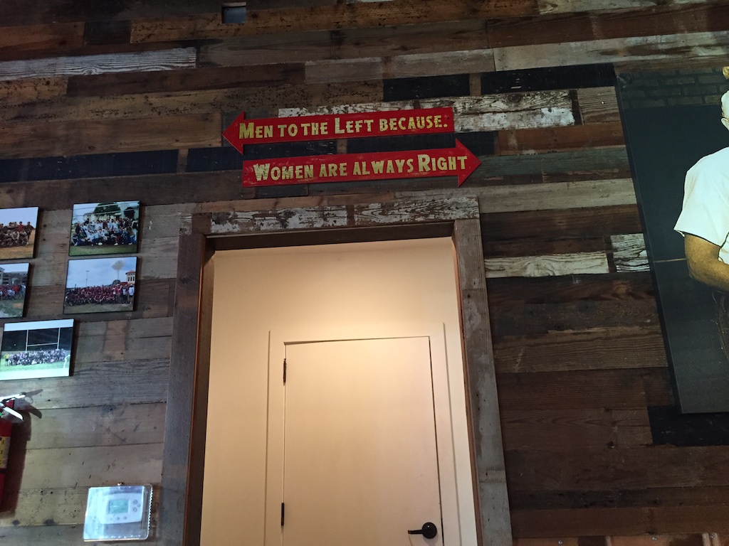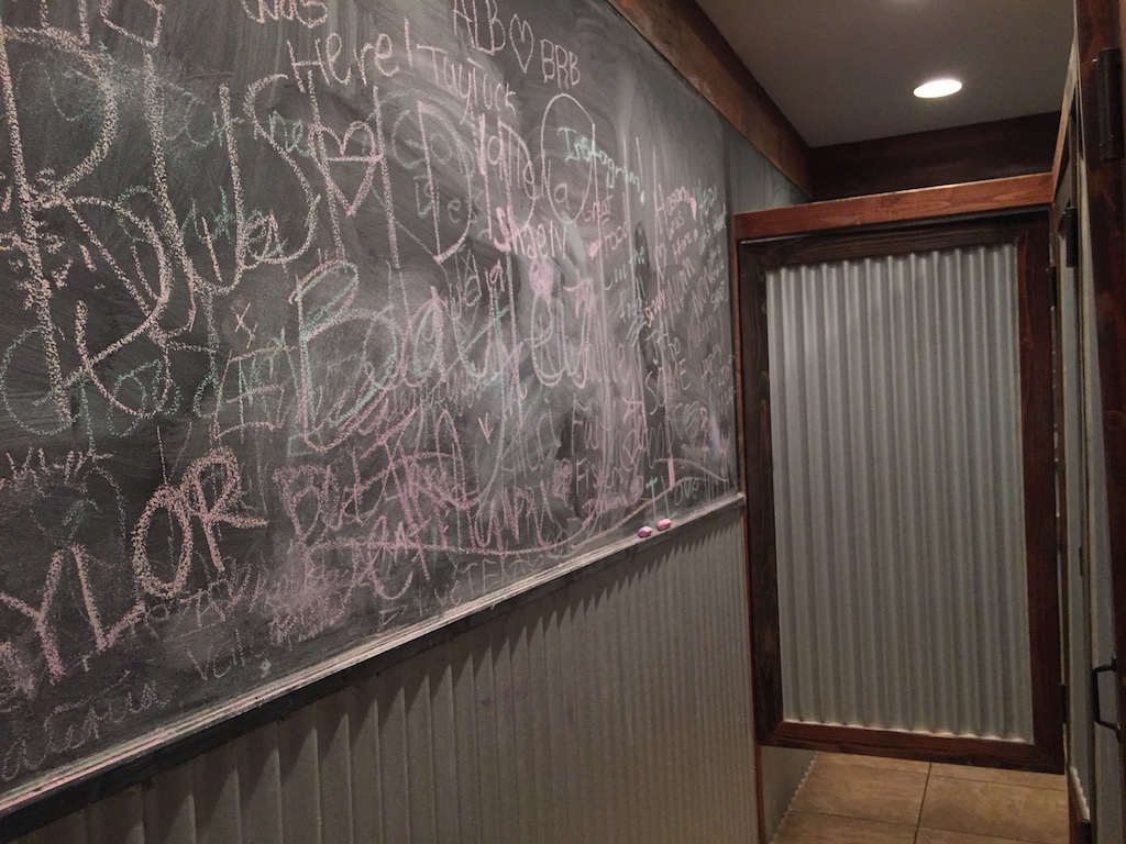 IMG_5356I took this photo inside the bathroom because I liked the idea, maybe because I’m using tin (albeit rusty and full of holes) for my upcoming State Fair display. The chalk boards in the bathroom and in each stall seemed to prevent grafitti on the walls.
