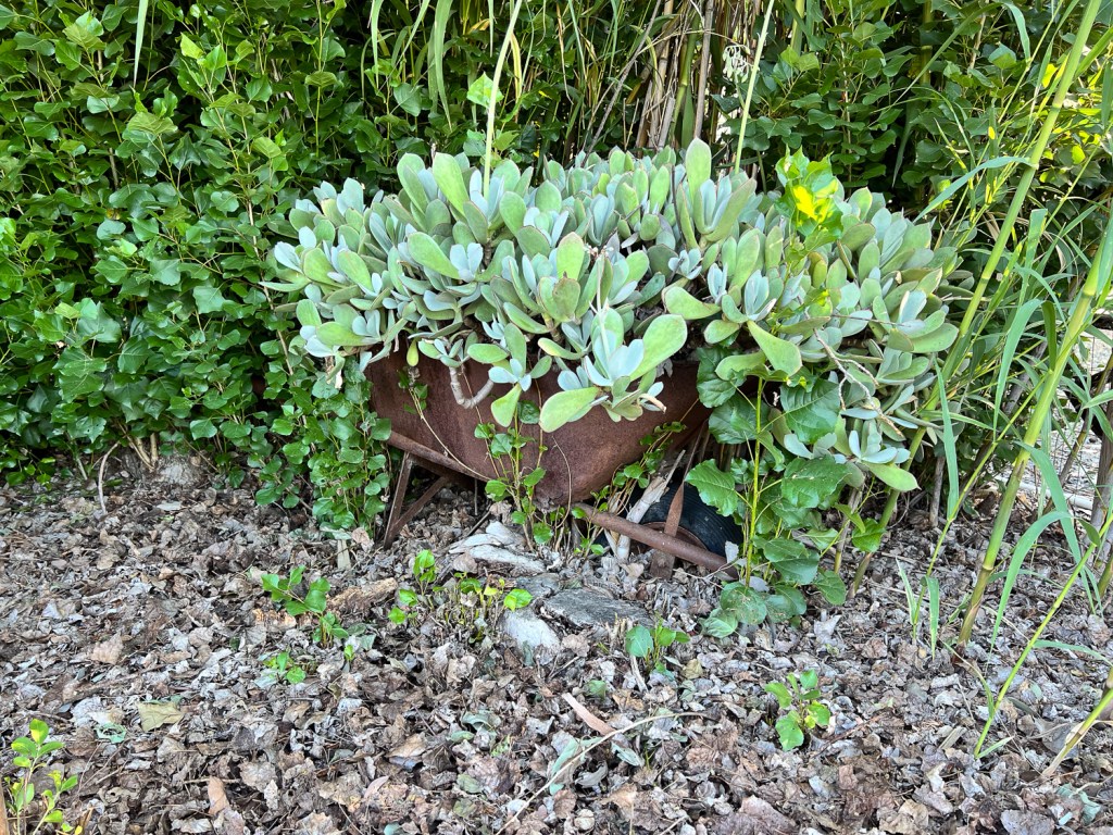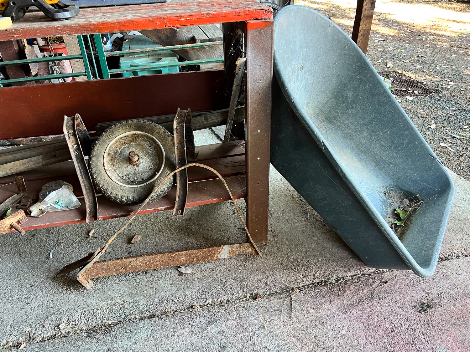 This started life as a wheelbarrow and when the “barrow” part broke Dan adapted it to a one-wheeled platform to move things around. It has been in one place for awhile and junk and pine needles have accumulated.