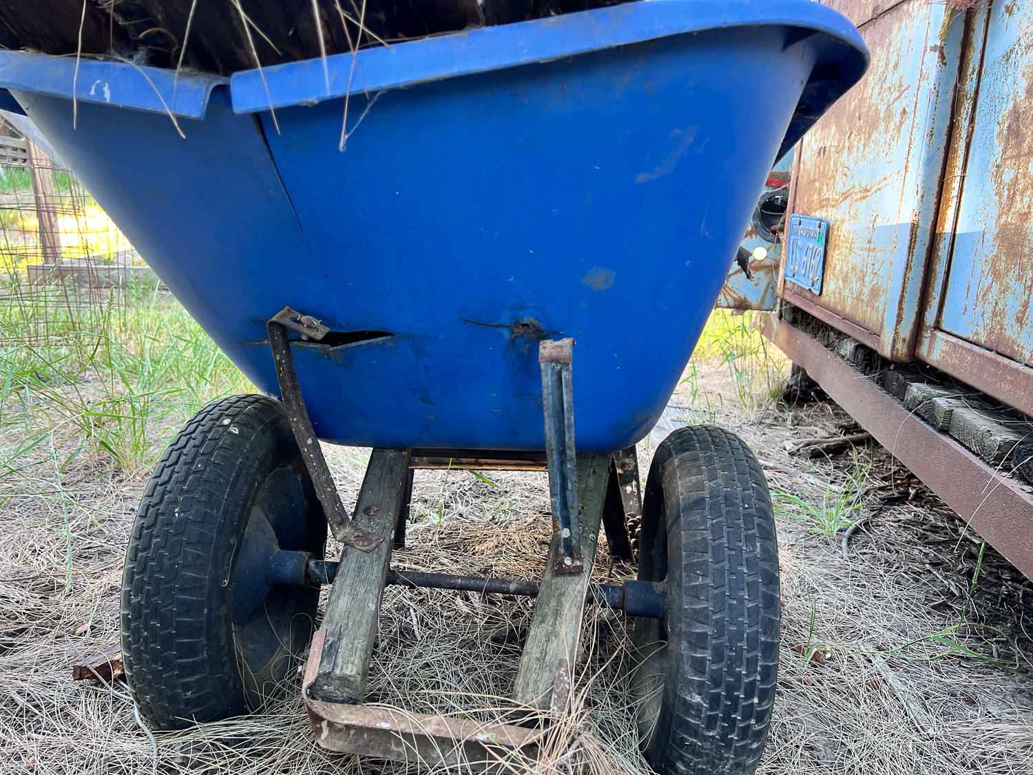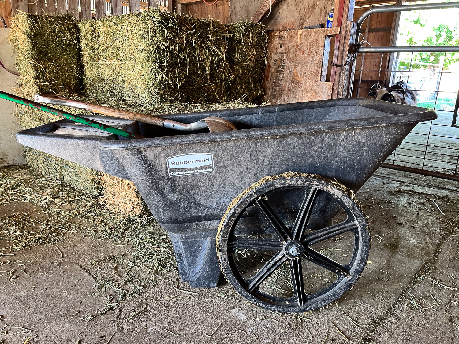 This is the current barn wheelbarrow. I think I’ve had this one since before we moved here in 1999.That tape has been on a crack in the handle for years and it has had new wheels. Is it possible that this is the wheelbarrow that came with us from the dairy? Maybe Rubbermaid should be making cars.