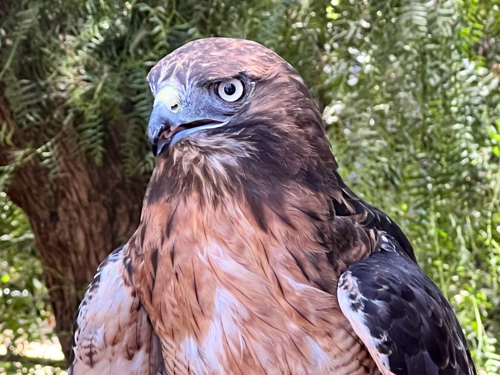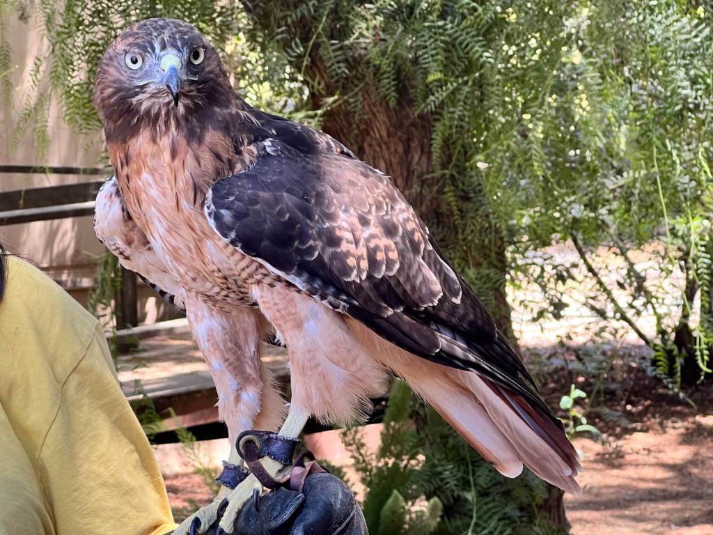 Some birds are also used for research purposes. This is Jack, a redtail hawk that is a resident. Jack had just completed a flight study, being filmed while flying and wearing sensors, before coming to the library.