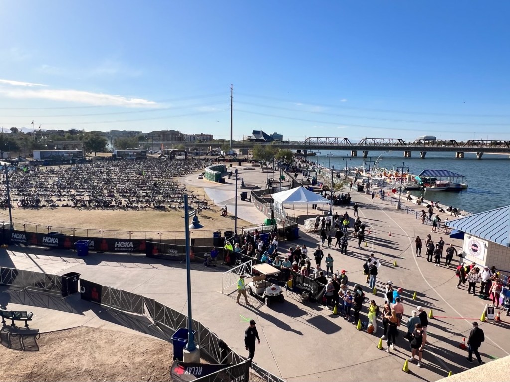 This view shows the transition area where all the bikes are and where the athletes had lined up along the river before the start of the swim