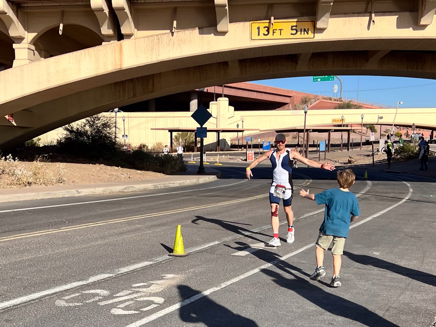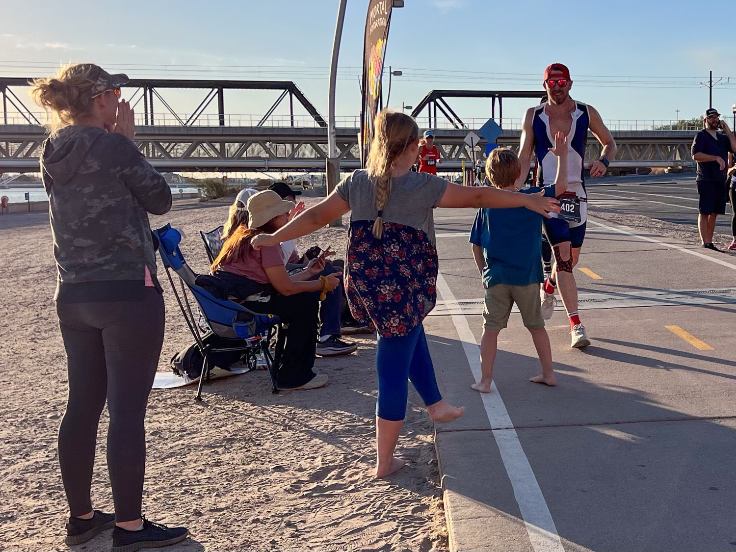 Meryl and Katie and the kids and I walked across a bridge to position ourselves where we’d see Chris twice as he went around the loop on this side of the river. Kasen made sure he got a High 5 in when he could.