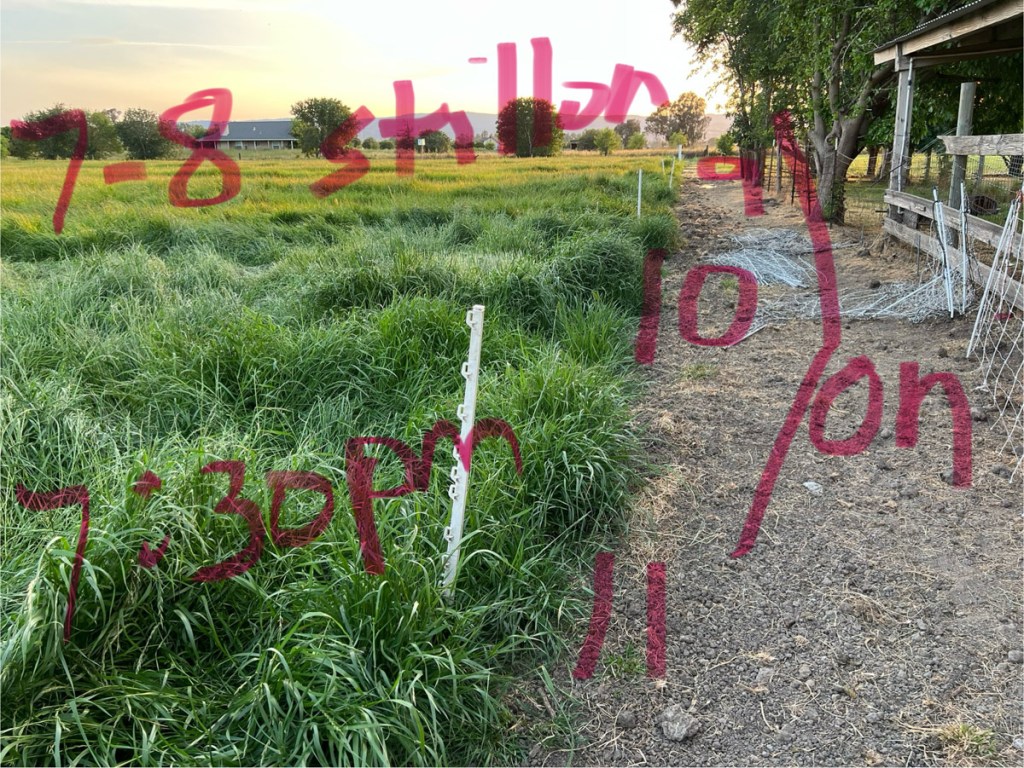 I needed a strategy to keep track of what I was doing. This was partly because the ryegrass was so tall I couldn’t even find the valves at first. Then I wanted to remember what I had opened and closed and be able to tell Dan how it was going. I decided to write on my photos. By the way, there are 7 valves across the north end of the north field near the blackberries. This photo shows the south end of that north field and the top of the lower pasture. There is a pipeline all the way across this one from west to east.