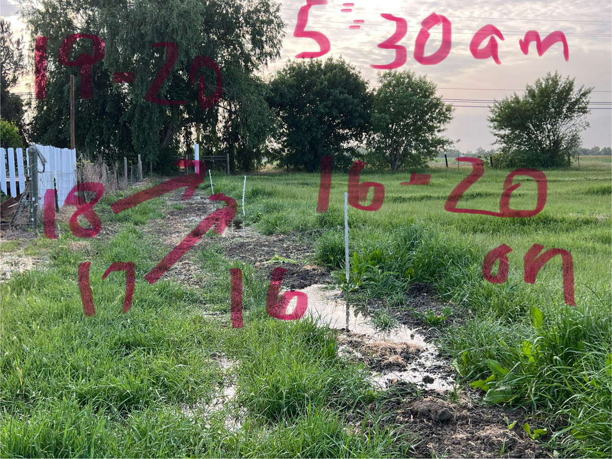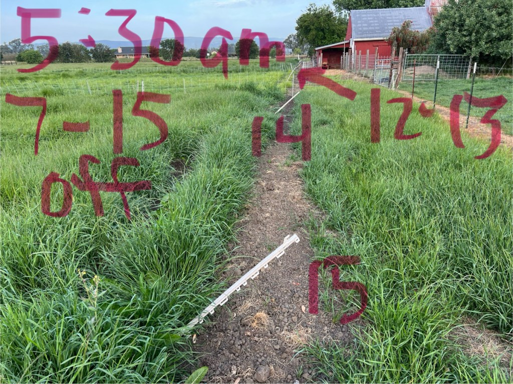 So this photo shows that at 5:30 p.m. there was water all the way down the north pasture and I had opened the first 6 earlier. At this time #1 on this field was finished and I turned #7 and #8 on.