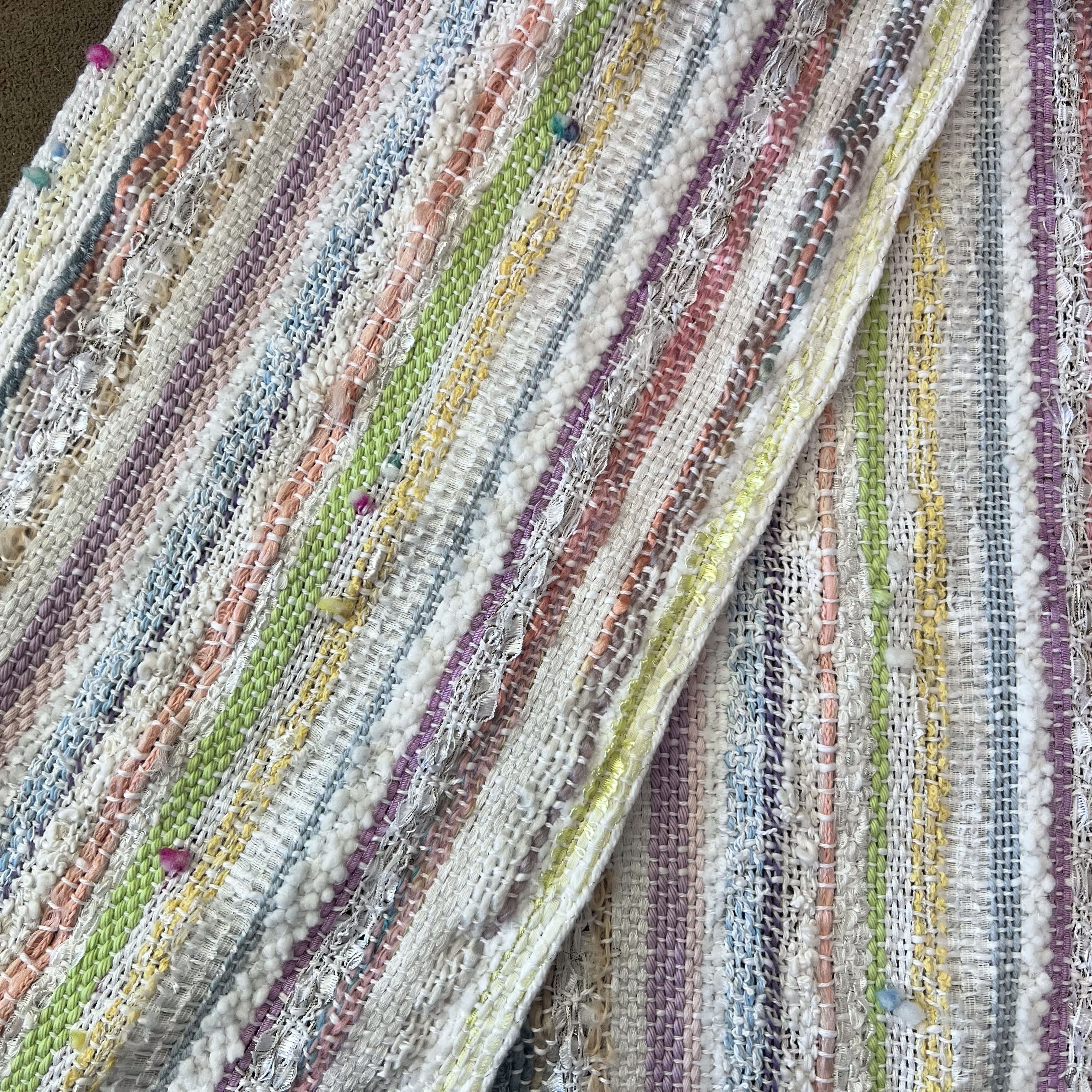 When you closely at this yarn you will see that the random lengths of yarn are tied together. I don’t think the intent was to use this for warp, but that is all that I see. I have figured out the method to turn this into a warp.