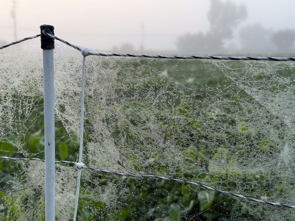 If you look up “spiders ballooning” you’ll find out that baby spiders will produce a strand or two of silk and be carried away by the wind. The net fence and the pasture plants easily catch those silk strands. So I don’t know how far those spiders have dispersed. Didi they start out here or elsewhere?
