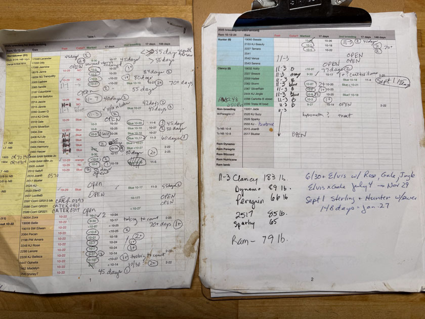The vet tech wrote notes while they were working but this is how my spreadsheet looked when we were finished. Those people in Farm Club would recognize this as my breeding chart. Breeding groups are color coded on the left and dates are recorded as we go. (In case you’re getting a close-up look the dates on the left are hoof trimming, not breeding.) But all those circles and other notes are how I transcribed what the vets were saying. Fortunately I was able to take the vet tech’s notes and redo this spreadsheet, putting the rows into order of due date. That’s what we’ll refer to when breeding season starts.