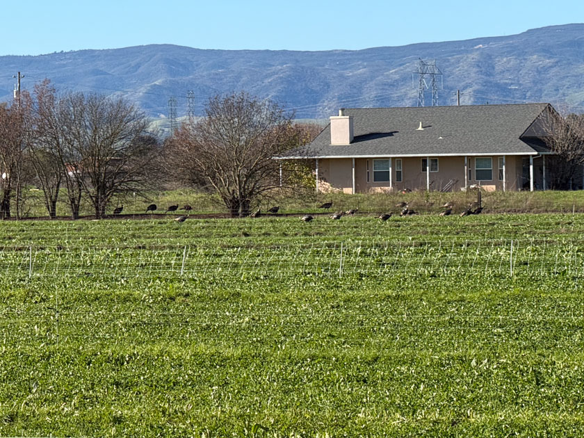 Later in the morning, working in the sunny garden I spotted about 20 turkeys at the far end of the pasture. That’s the neighbor’s house in the background.