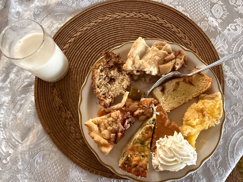 When I got back to the Home most people were in the dining room and ready for our customary breakfast–PIES! With apple, pumpkin, peach/berry, lemon custard, quiche, and a couple of breads, I think all the food groups are represented!