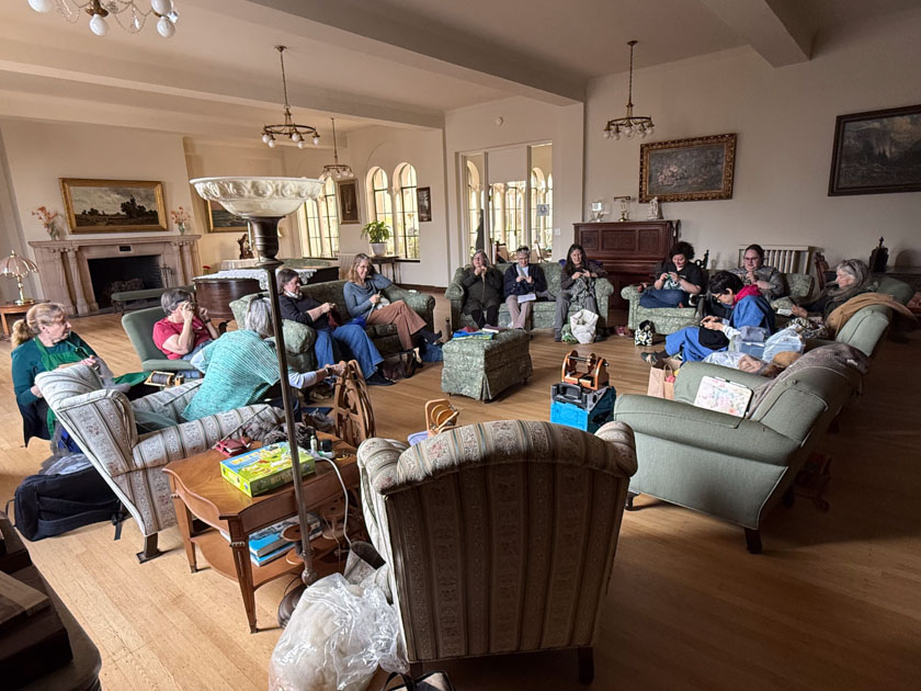 We gathered in the parlor for more spinning and knitting time with plenty of good conversation. As our group expanded we gathered all the furniture in this room for our circle.