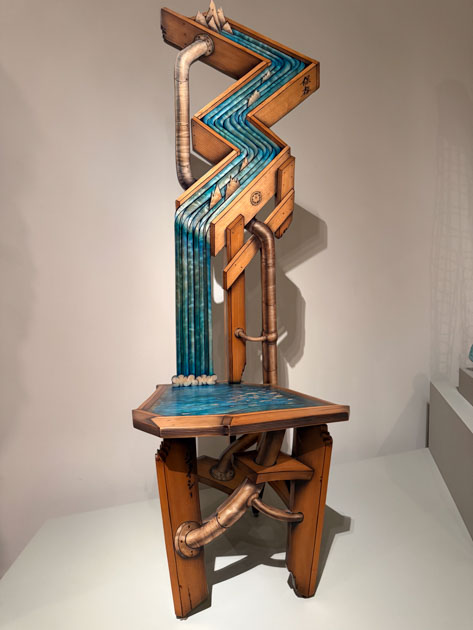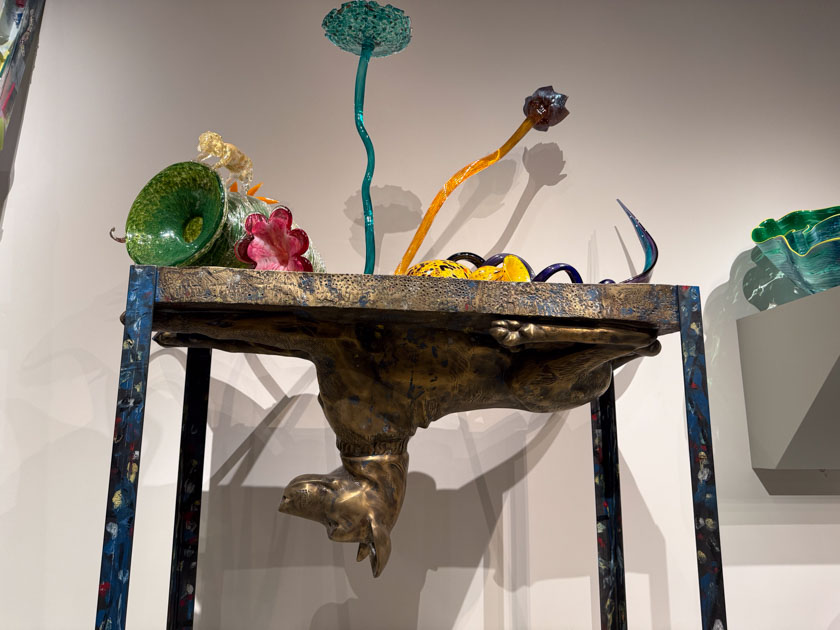 This one makes me wonder WHY? This is part of an exhibit of glass art, but I don’t understand the dog attached upside down to the table.